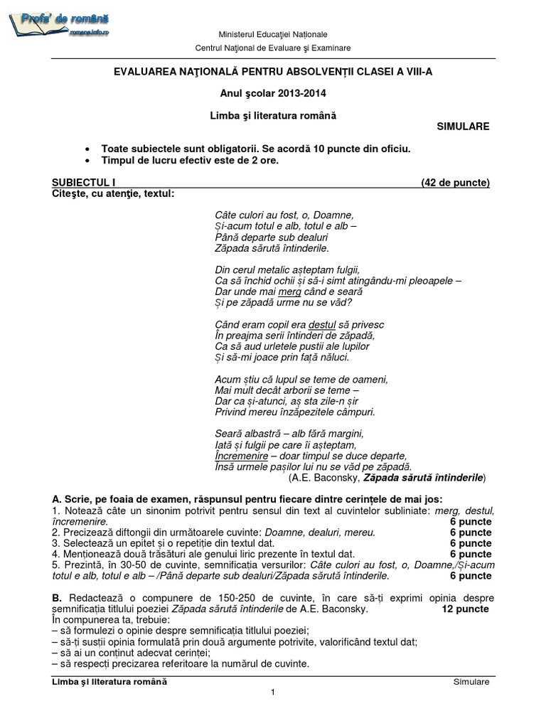 Ministerul educańiei, cercetării, tineretului şi sportului centrul nańional de evaluare şi examinare. Evaluarea nationala 2012 subiectele la examenul de limba si literatura romana: • toate subiectele sunt obligatorii.