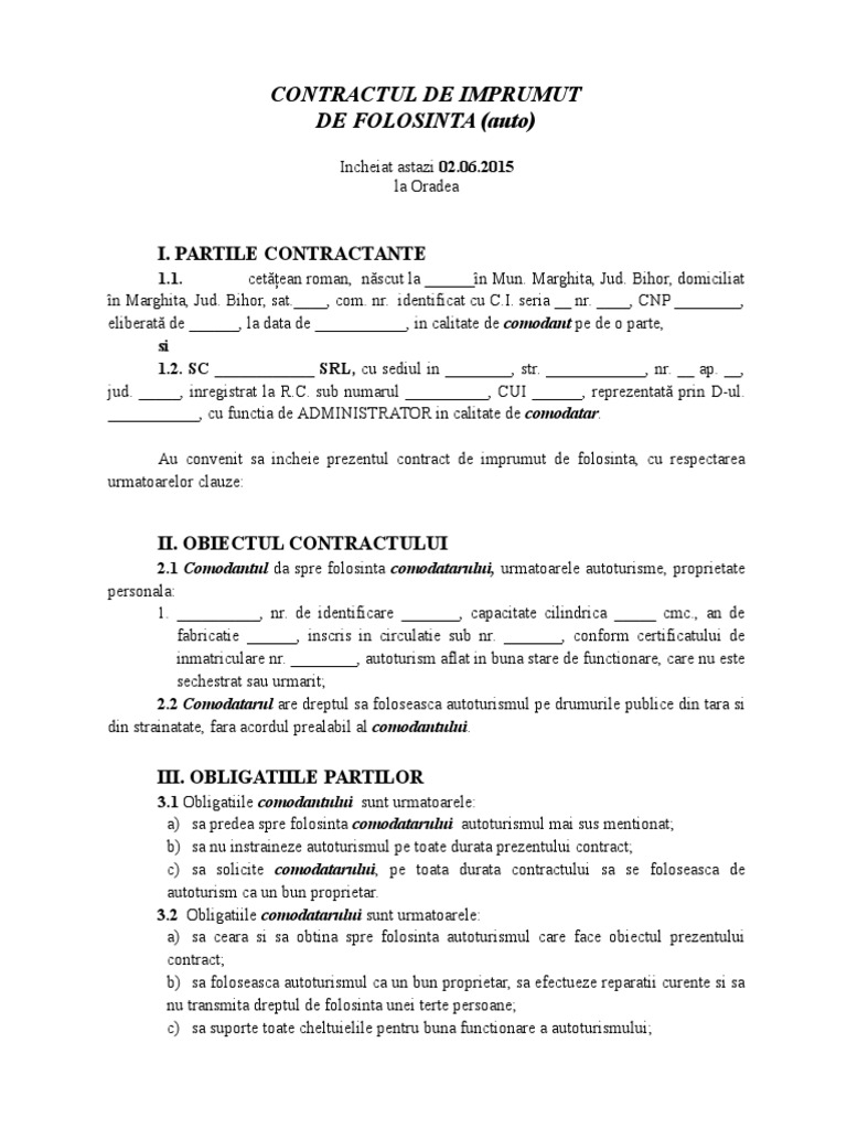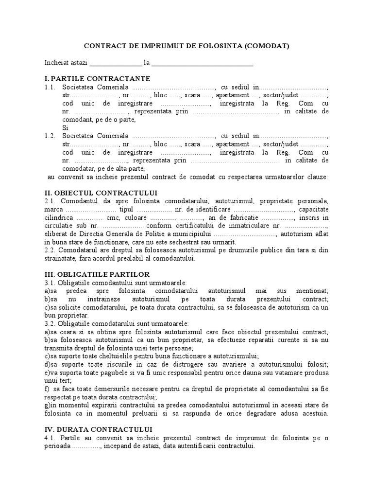 vizitati articolul complet aici : https://ro.scribd.com/doc/265540086/Contract-de-Comodat-Auto Lntentia de reziliere a contractului de catre una dintre parti va fi cornu nicata celeilalte parti cu 20 zile înainte de data propusa pentru reziliere. Contract de imprumut de folosinta bun imobil.rtf. Conform acestuia, proprietarul unui autovehicul, numit și comodantul, împrumută în mod gratuit dreptul de folosință a mașinii unui.